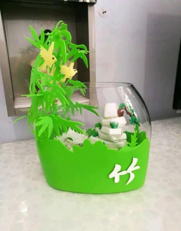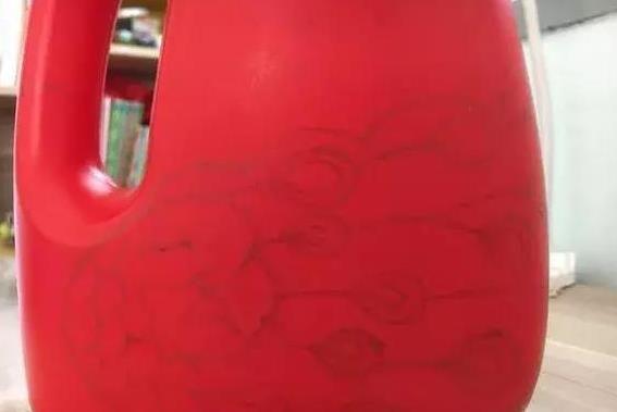 撕掉标签之后,用铅笔在瓶壁上,画出花纹,画什么都行。留出把手的部分,把花纹以上部分剪成两半