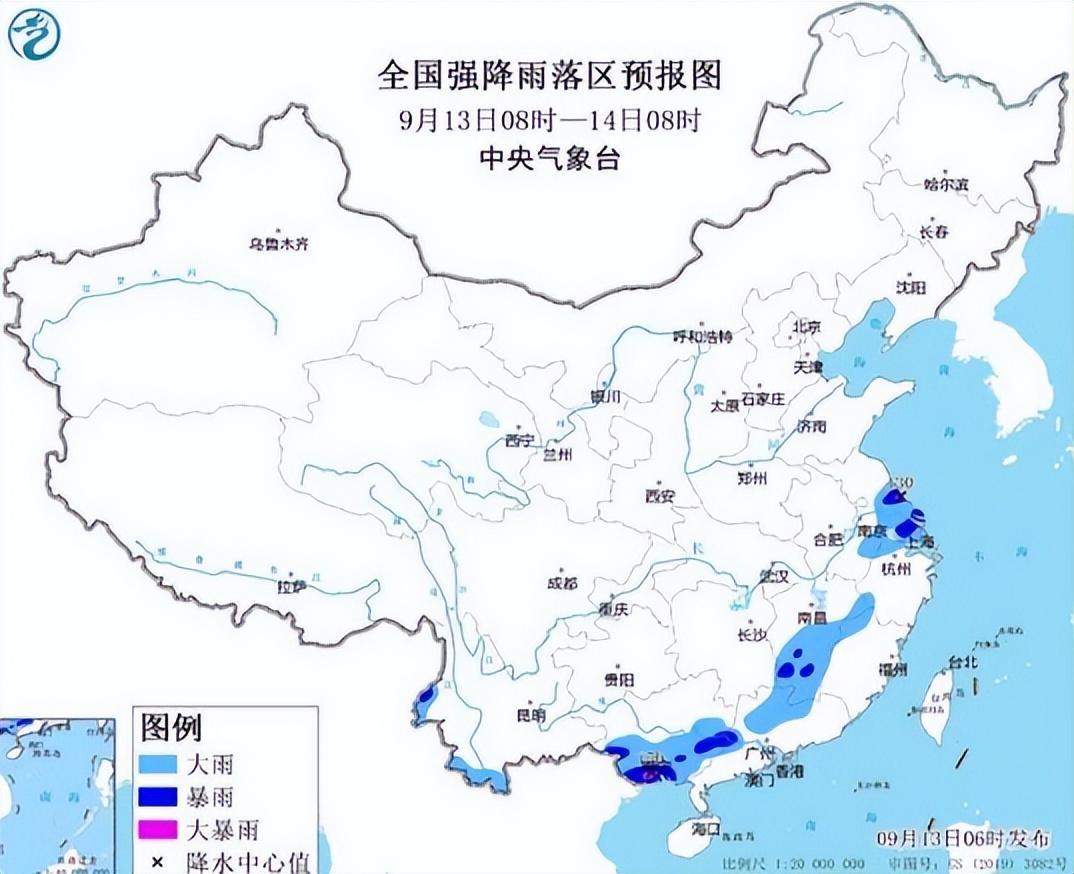 根据中央气象台的预测,从9月13日08时至14日08时,安徽南部、江苏中南部、上海、江西中南部、浙江北部、福建西北部、广东北部、广西东部和南部、云南西部等地的部分地区将出现大到暴雨。其中,江苏中部、广西南部等地的部分地区将迎来大暴雨(降雨量在100~150毫米之间)。上述地区还将伴有短时强降水(最大小时降雨量在20~50毫米之间,局部地区可能超过60毫米),并可能出现雷暴大风等强对流天气。