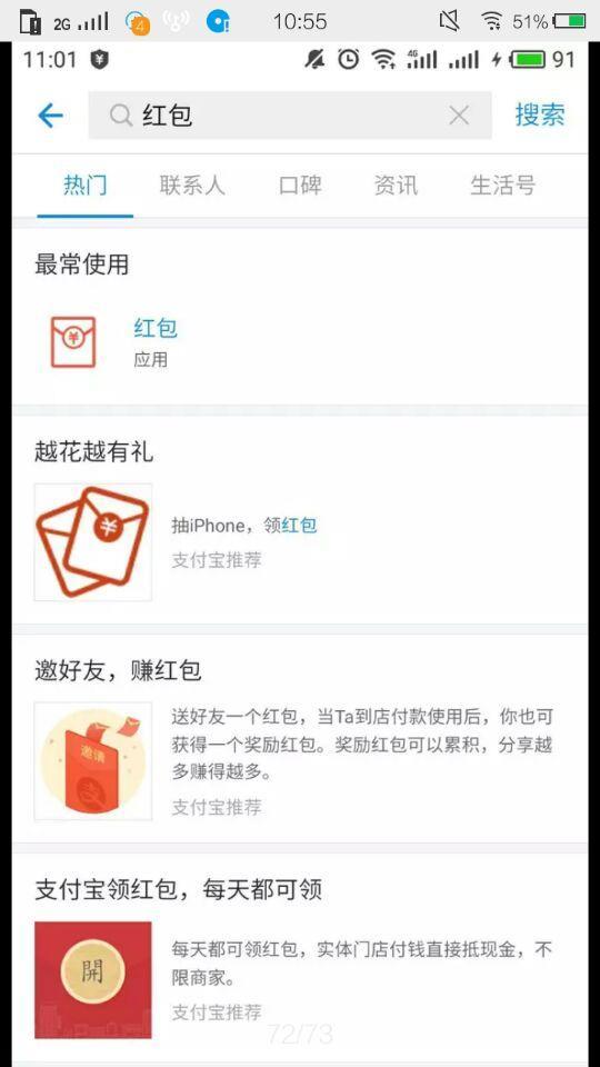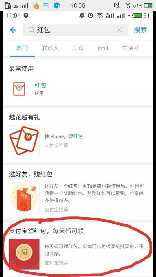 首先, 打开图1所示的支付宝首页,点击勾画处。有些支付宝帐号可能不会直接显示红包,不管显示什么,都可以点进去搜索即可。