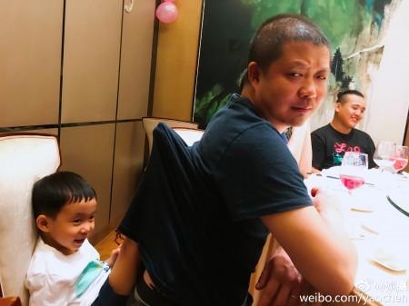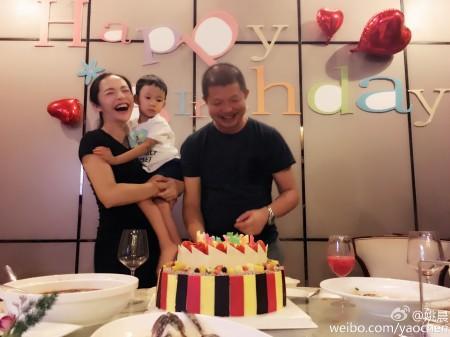 姚晨晒出的照片中,桌子上摆着大蛋糕及饮料等,姚晨抱着儿子小土豆甜蜜地为曹郁庆生。还有一张是小土豆坐在曹郁的身后,调皮地将一双小脚伸进老爸的衣服里,开心地蹬著,曹郁虽故装不高兴但还是难掩幸福之情。