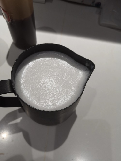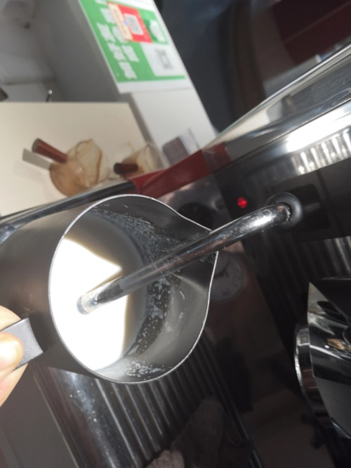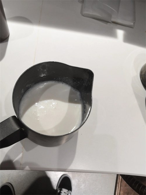 第三步,打奶泡。先讲奶导入拉花缸中,然后进气,使牛奶旋转,打中浓厚的奶沫
