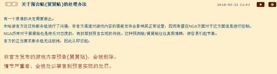 随着国内手机游戏的蓬勃发展,大批玩家都被手游的魅力所吸引。随着玩家的人数越来越多,游戏开发厂商也渐渐退出了不少限制。近日,NGA的崩坏3板块出了一条新规定。以后所有的预测帖子已经发现将会直接做删除处理。具体怎么一回事呢?大家就和小编一起来看一看吧,