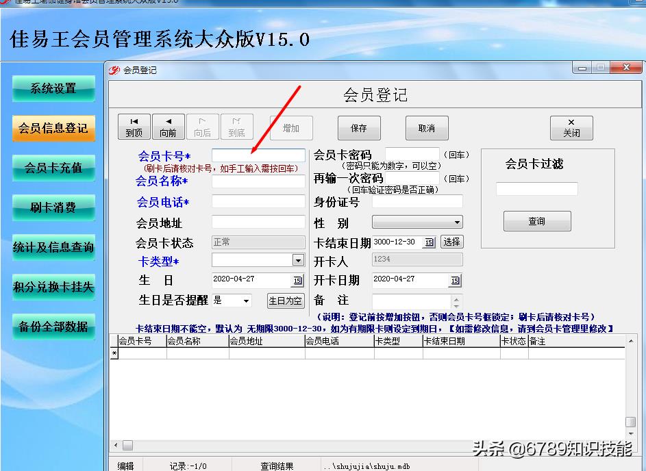 操作流程:点击 增加按钮,在会员卡号框里使用读卡器读取卡号,输入会员姓名和电话等信息,