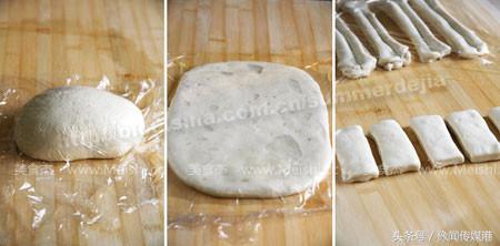 1.将酵母、盐、小苏打放入温水中溶解,加入面粉中和成团,饧二十分钟(图1)