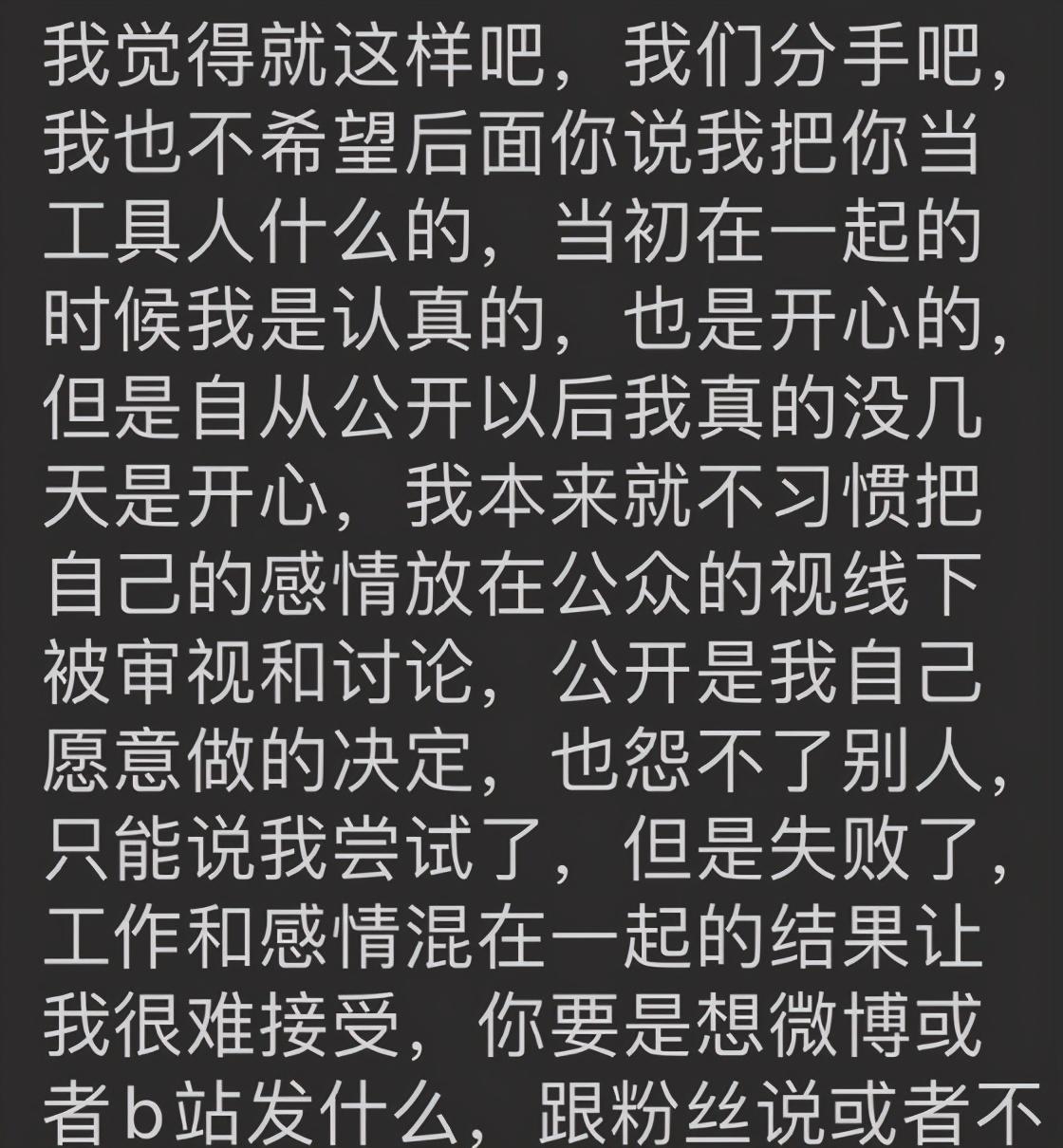 俊晖在微博中描述,自从公开恋情之后,两个人就出现了大问题。因为他和柴西的想法不同,两个人没办法分开工作和生活的区别,最终只能痛苦地选择分手。俊晖表示他已经尽力了,但是得不到柴西爱的反馈。