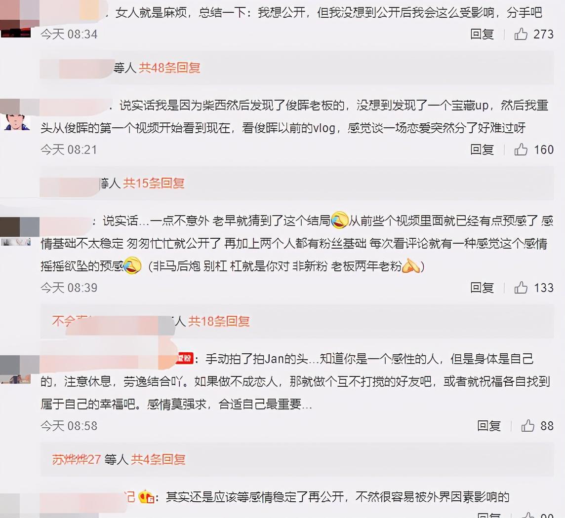 这件事一时间引起大批网友的热议,不少人都在心疼俊晖,同时也对两人没能走到最后深表遗憾。其实早在他们公开的时候,柴西好友周淑怡就说过,两个人考虑的东西太少,如果以后闹掰了分手岂不会很尴尬。