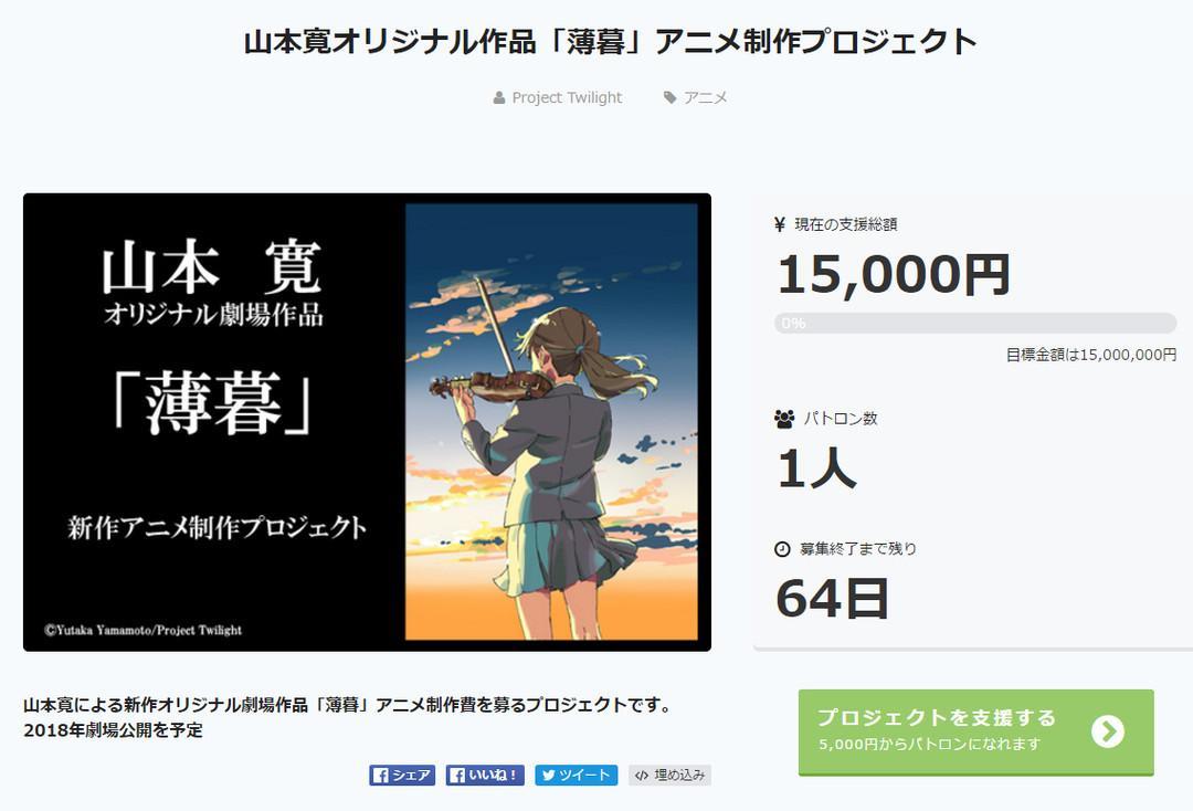 山本宽监督新作原创剧场动画《薄暮》,动画制作费众筹开始,预定将于2018年公开!