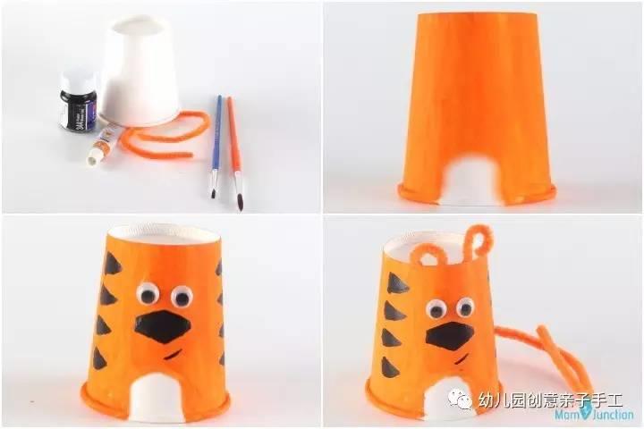 选择一个白色的纸杯、整体涂上橙色的颜料(预留一个小门)。两边画上小老虎的黑色斑纹,鼻子和嘴巴,最后,贴上手工眼睛、扭扭棒做的耳朵与尾巴