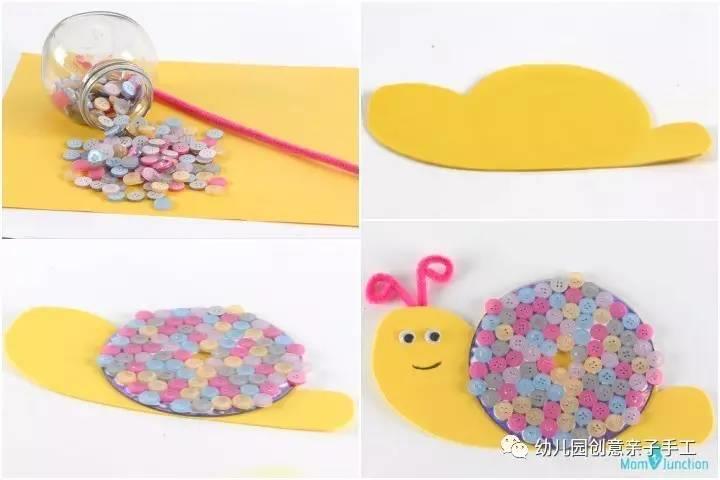 在海绵纸上剪出小蜗牛的身体,中间凸起的部分放上圆形的废旧光盘。准备大量彩色的纽扣,让孩子有序地粘贴填满整个光盘,最后加上扭扭棒、手工眼睛,还有画上小蜗牛的嘴巴。