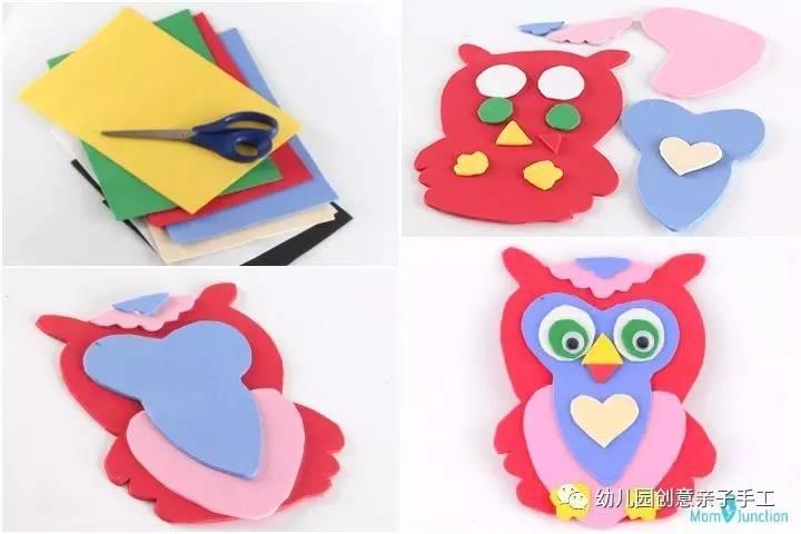 在海绵纸上上画出猫头鹰、心形、圆形等各种形状后,剪下,按下图的粘贴方式组建一只可爱的小猫头鹰。