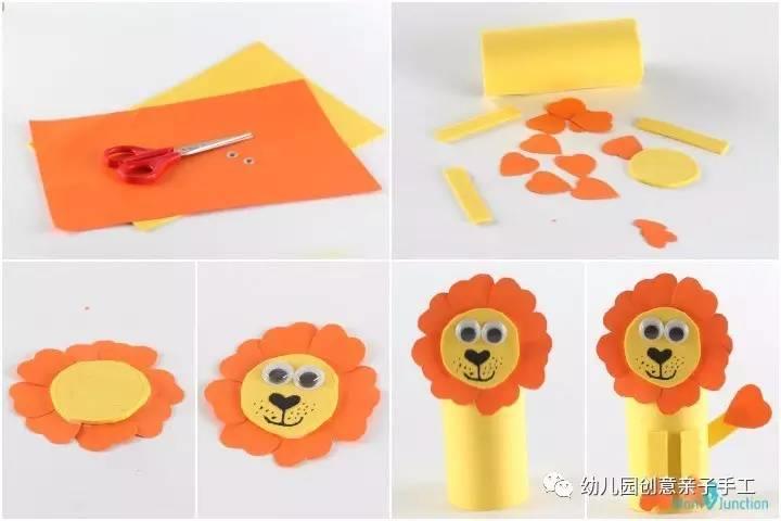 将黄色的海绵纸覆盖在卷纸筒上后,剪出图二中的形状,先拼接起小狮子的头部,完成五官的修饰。最后用热熔胶黏上卷纸筒、尾巴还有两只脚。