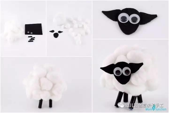 先用海绵纸和手工眼睛做出小羊的头部。之后用报纸揉成一个小球,定型。粘贴准备好的棉花球,最后底部加上四个吸管做的羊脚。