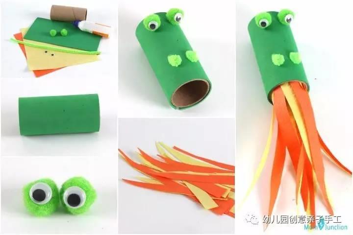 给卷纸筒包裹上绿色的海绵纸,用毛毛球粘贴好眼睛与鼻子,最后贴上长条状的海绵纸即可。