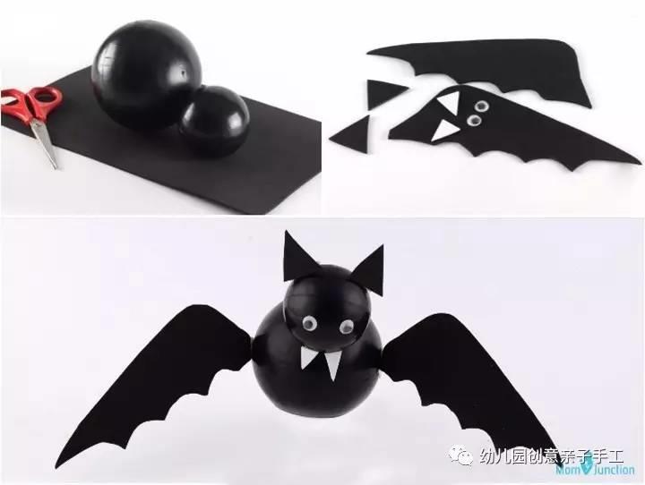 先用热熔胶粘好两个大小不同的珠子,做小蝙蝠的身体,接着,用海绵纸剪出翅膀、耳朵还有牙齿,如图粘贴起来即可
