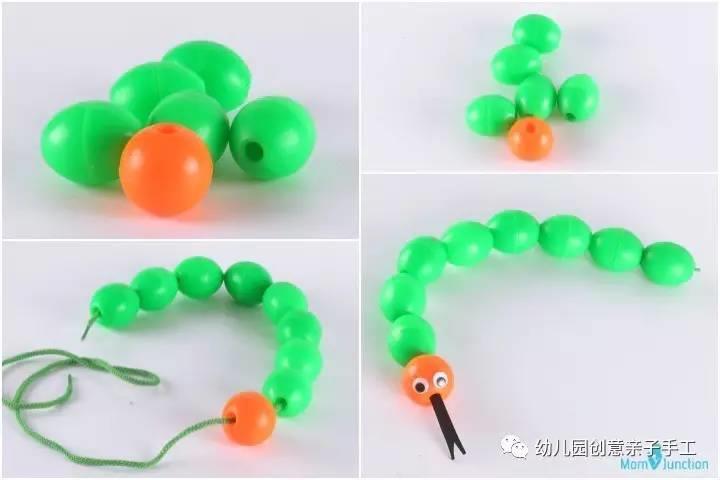 用绳子将准备好的珠子穿起来后,贴上眼睛,和海绵纸做的舌头即可。