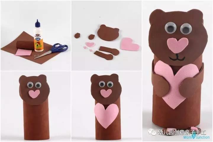 给卷纸筒涂上棕色的颜料,之后将海绵纸剪出图二中的图形,贴上卷纸筒上,一个代表爱与拥抱的棕色小熊就完成啦!
