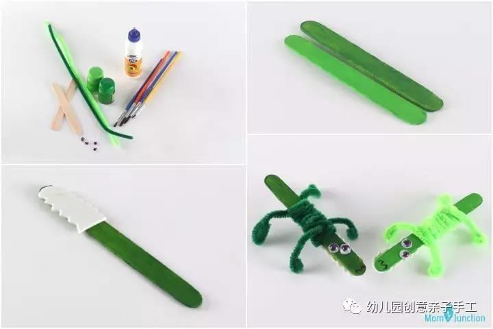 将冰棍棒洗净后涂上绿色颜料,用海绵纸剪出约1~2cm的边缘锯齿状做鳄鱼的牙齿。翻到反面用扭扭棒缠绕做出身体。贴上眼睛,画上嘴巴,小鳄鱼栩栩如生。