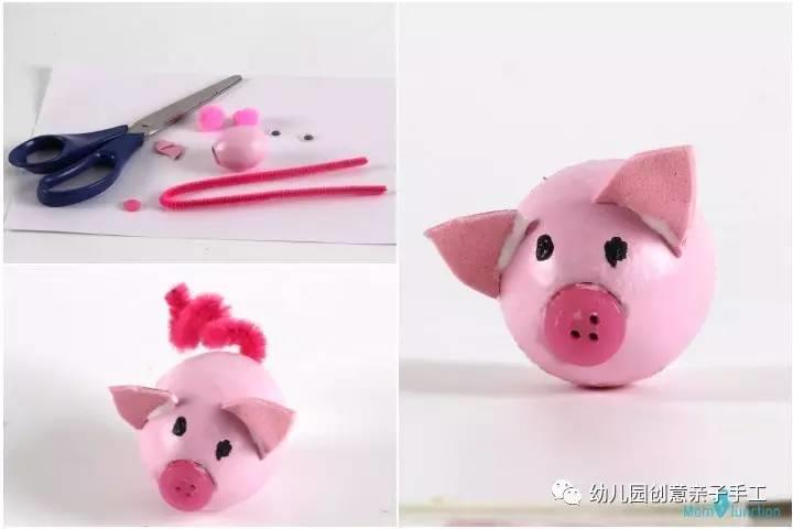 用纽扣是小猪的鼻子、扭扭棒是尾巴、还有三角形的海绵纸耳朵。最后用一个黑色笔画上小猪的眼睛。