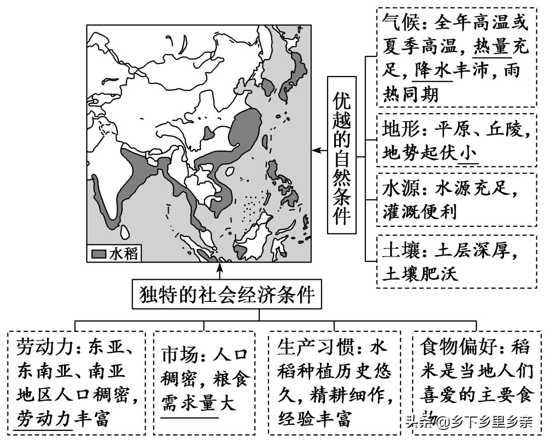 ②生产特点:“三低一高、一大一小”。小农经营;单产高、商品率低;机械化、科技水平低;水利工程量大。