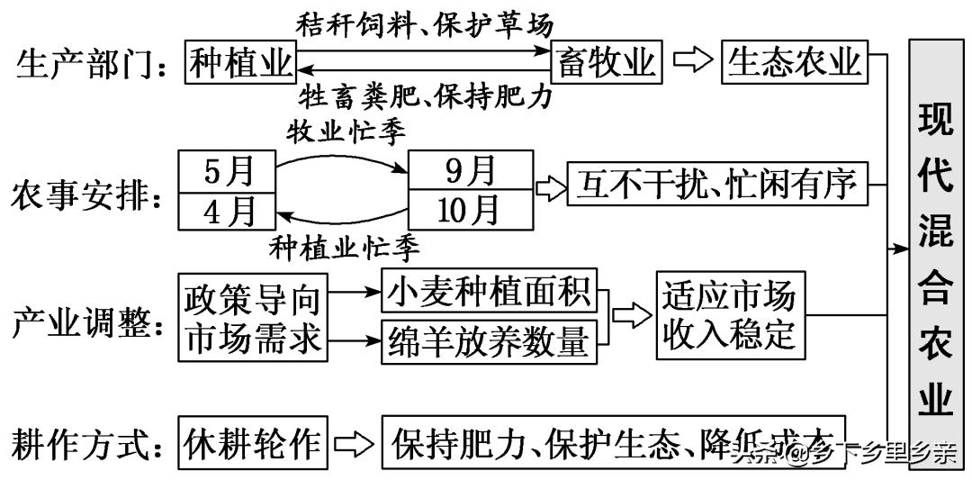 澳大利亚墨累—达令盆地以小麦—绵羊混合生产为主,是现代混合农业的典范。其特有的生产优势如下图所示: