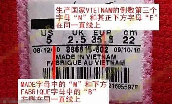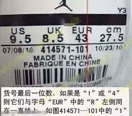有句话说得好,鞋标真,鞋子不一定真;但是鞋标假,鞋子一定假,所以请大家务必先掌握鞋标的基本构成。鞋标上的工厂代码、尺码栏、日期、货号、生产国家、条形码区,一套磨具几百万,隔几年更新,仿货鞋标很难做到一模一样。所以,鞋标就成了鉴定的重点。但记住上面两句话,比较一个真的鞋标上淘宝都能买到。