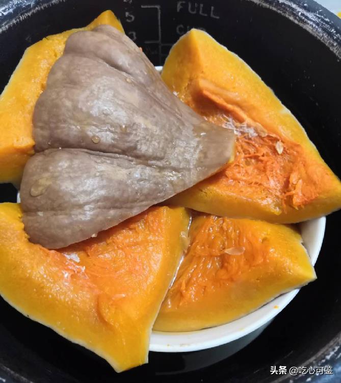 在具体做不同吃法之前,有一个共同的步骤:剖开老南瓜,去瓤和籽后洗干净,再连皮切成几块,放入蒸锅中蒸至软烂状态。(南瓜子可以留着做成小零嘴)