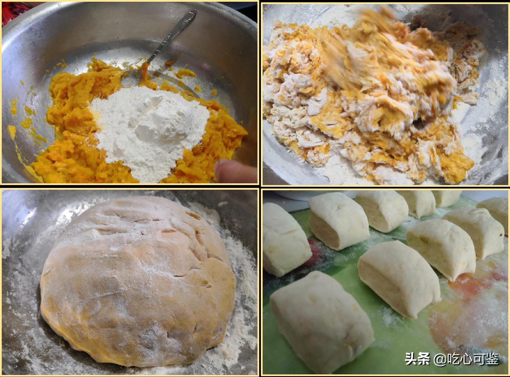 蒸好的南瓜晾一会,等温度不再烫手再取南瓜泥。把酵母粉撒入南瓜泥中,静置几分钟,待其自然融化,搅拌几下。在南瓜泥中加入半小碗玉米粉。(因为妈妈喜欢,觉得多吃粗粮身体好)往南瓜泥中加面粉,用勺子或筷子拌成絮状。面粉不要一次性加太多,要少量多次,这样好控制面团的干湿度。揉啊揉,揉出一个光滑的面团。如果喜欢筋道一点的口感,那就多揉一会儿。盖上湿布,找一个暖和的地方让面团慢慢发酵变大。(现在气温低,可以午饭后揉面,这样到了晚饭时间,面团就发酵得差不多了)拿出案板,撒一层干粉。取出面团,在案板上再次揉光滑,变成长条形状,然后切成一个个小面团,习惯吃多大的就切多大的吧。锅内倒水,架上蒸架,铺上屉布,放入小面团,面团之间留出间隔,盖上盖子。把蒸锅放在暖合的地方静置10分钟,小面团会再次变大。开火,听声音或看水汽,水开后蒸15分钟,然后关火,等三分钟在开盖。