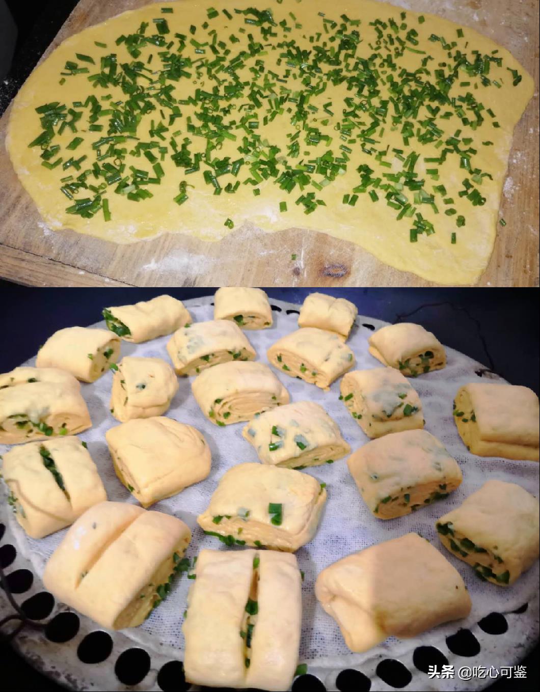 参考做南瓜小面包的1-6步,得到一个发酵好的大面团。案板上撒一层干粉,把面团放在案板上擀成薄片状。在面片上抹上一层油,均匀撒上切好的小葱。口味重者可以再撒一些辣椒粉。把面片转起变成条状,用刀切分一个个小方块。参考做南瓜小面包的8-9步,蒸出一锅香气扑鼻的南瓜葱花卷。