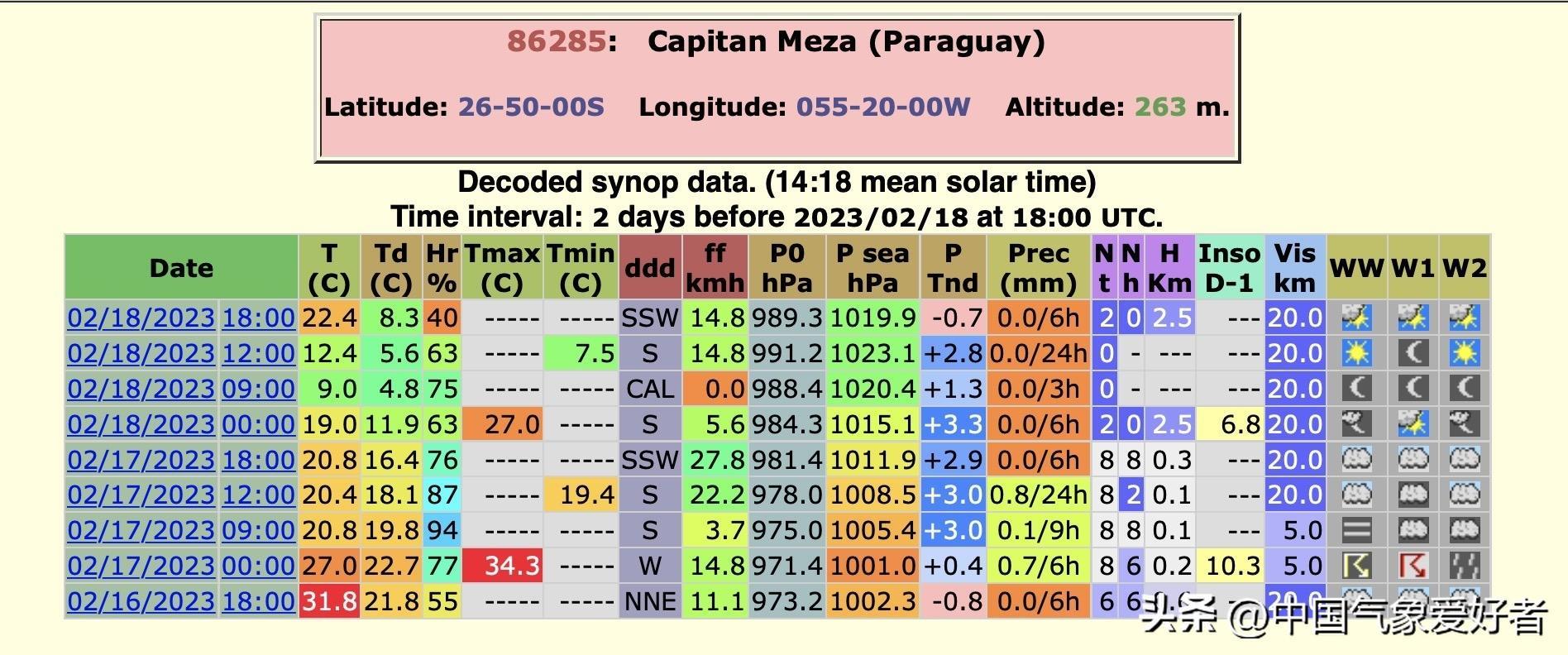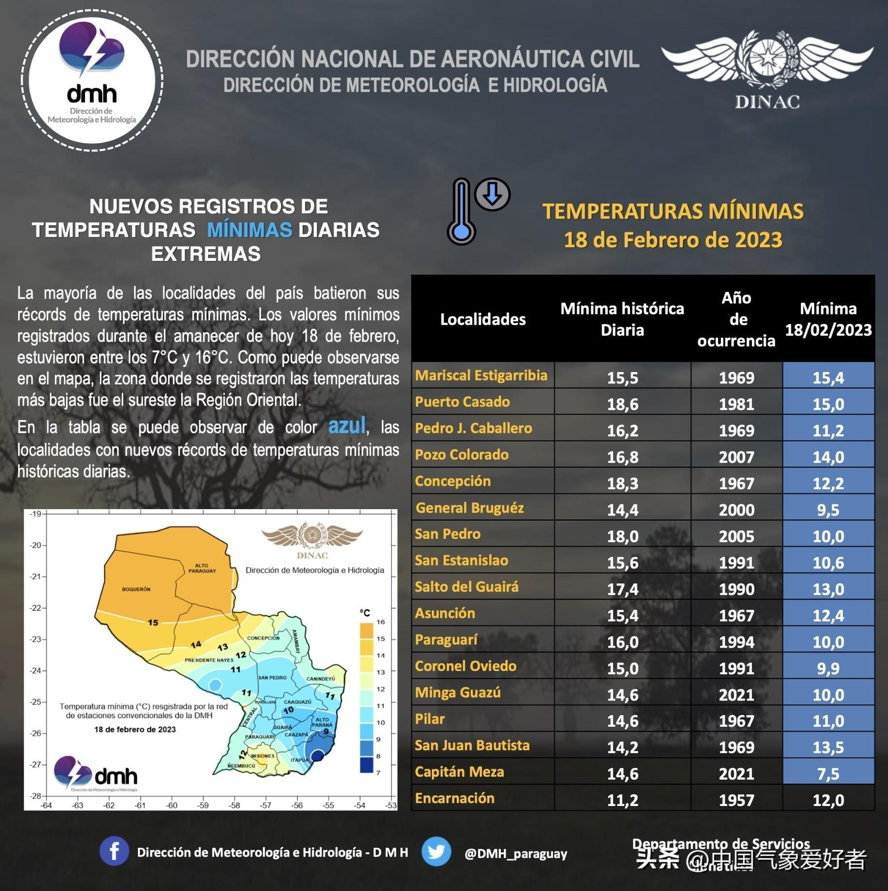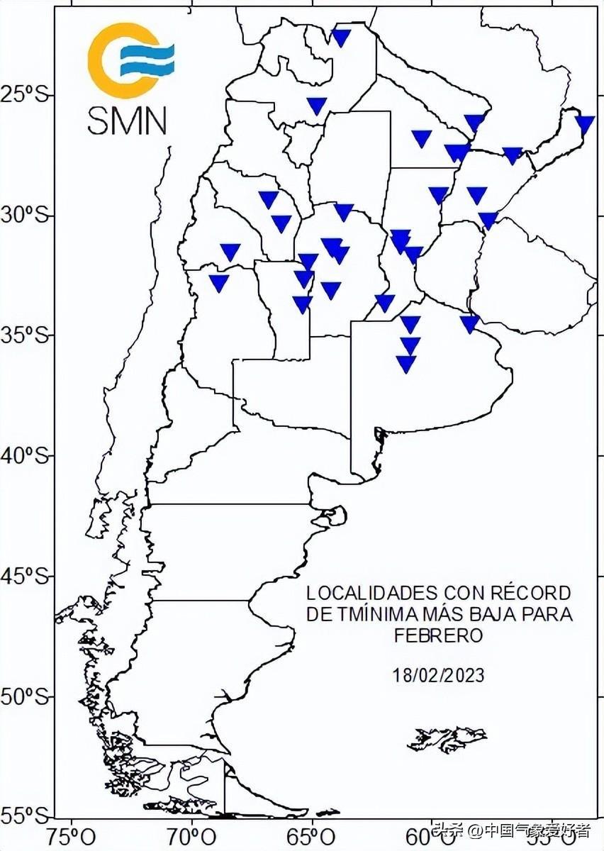 例如阿根廷,阿根廷气象部门指出,阿根廷有至少30个城市的2月最低气温记录被打破。在乌拉圭,Artigas出现了7.3度的2月历史性低温。在巴西,Bage和Santa Maria两站同样出现了相当不寻常的2月低温。巴拉圭出现的7.7度更是比2月全国历史最低气温还要低,显示出这次寒潮的不同寻常。