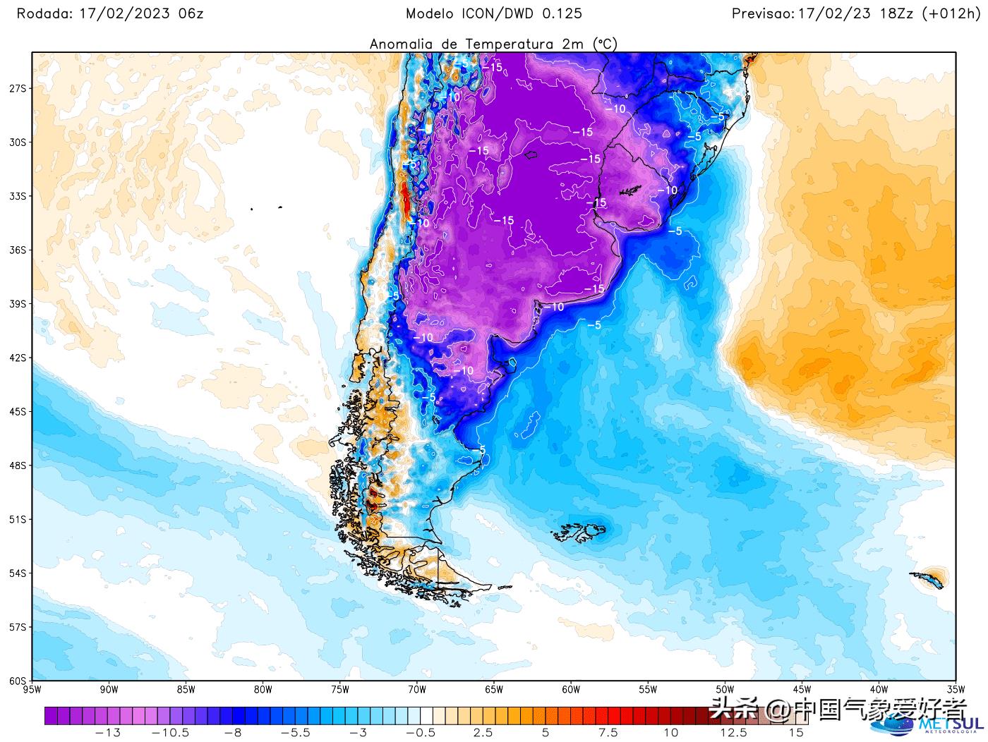 实际上,近期南美洲变色的不只是智利,同属于南美洲的阿根廷,也在近期遭遇了“变色”——2月17日,随着2米气温分析图上,阿根廷、乌拉圭和巴西多地变成了深蓝色甚至是深紫色,代表着一次强烈的寒潮正在来临,不少地方近地面气温正处在强烈的偏冷趋势当中。