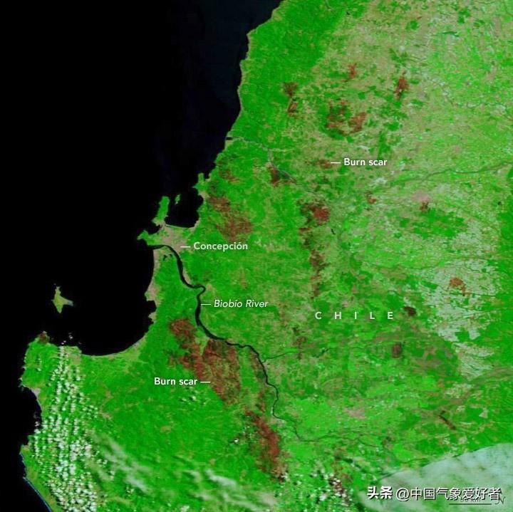 2023年2月上旬爆发的智利大规模山火,已经在智利中部和南部肆虐并造成数十人死亡、数千人受伤,许多人无家可归。尽管这些天智利的火灾已经减弱,浓烟滚滚的景象已经看不到,但实际上,火灾造成的焦土在太空中仍然清晰可辨。2月14日下午,NASA的一颗卫星对准了智利中南部多地,该地区近期爆发的大量火灾已经在卫星图像上显示出了“伤痕累累”的状态,这些便是发生在智利Biobío和Ñuble两个地区的大量火灾所导致的。