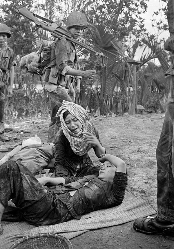 图5:1963年9月15日,一位悲伤的母亲瘫坐在受伤的女儿身边,她的女儿因不幸被美军直升机上的机枪击中一时不能动弹。这位母亲憔悴的脸颊写满了痛苦与无奈,此刻的她手足无措。此时,恰巧一支越南士兵从旁边走过,他们脸上也透露出一股悲伤与同情,毕竟是自己的同胞。