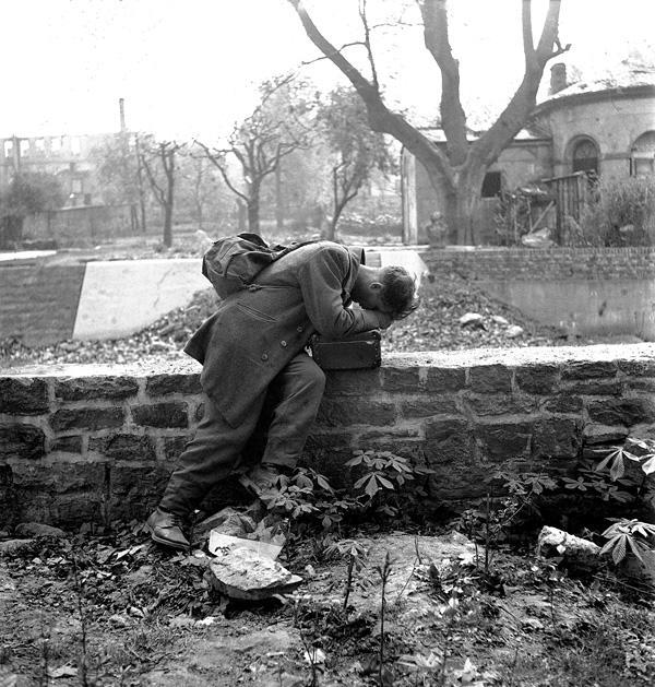 图11:1947年3月4日,一位曾被美国俘虏的德国士兵刚回到自己在法兰克福的家乡时却只发现了一片废墟,痛苦无助。此刻,这名德国兵伏在自己的行李箱上一动不动,行李箱里则装着他带给家人的礼物和自己的战争奖励。只是,战火过后,昔日那充满欢声笑语的家园荡然无存,家人的去向、自己的前程皆处于一片渺茫。包里的礼物和勋章在此刻竟有些可笑!