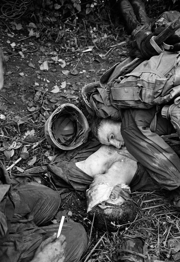 图4:1966年9月17日,一名士兵正趴在自己受伤同伴的胸脯上听同伴的心跳,军帽瘫落一旁,他的兄弟在战斗中不幸被流弹击中头部,命悬一线。照片左下角虽然只露出了一副膝盖和一只拿烟的手,但浓浓的战友情让人泪目,或许他想在战友走前让他抽最后一根烟缓解一下疼痛吧……