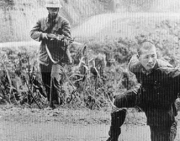 图9:图为因被敌军炮弹震昏才被越军捆住的我军解放军, 他在行刑前誓死不下跪!注意看他腿的姿势和脸上的表情,当时,越南为了让苏联记者给他拍照便打伤了他的右腿才致使照片呈现出的“跪姿”,随即就枪决了他。战后,该解放军被授予“革命烈士”称号,追记一等功!