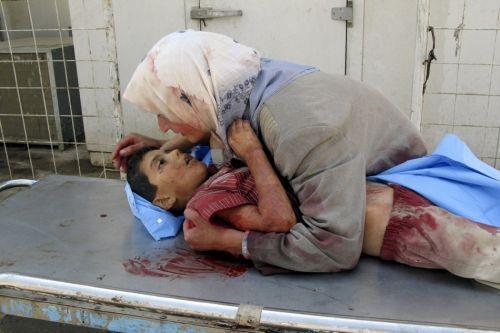 图6:2003年,伊拉克战争爆发,一名母亲正抱着自己不幸受伤的孩子。这位母亲俯身认真倾听,浑身带血的孩子举起的右手似乎在向最亲的人表达着自己的痛苦,他还只是个孩子啊……在战争来临前,这位母亲想做很多事情,她也想保护她的孩子,但是她却什么也做不了,她内心的伤痛没有人能懂……