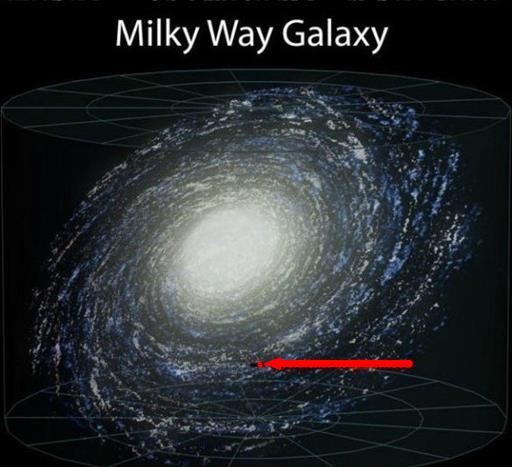 再扩大,太阳系以外,这是我们的银河系,红点是太阳系…