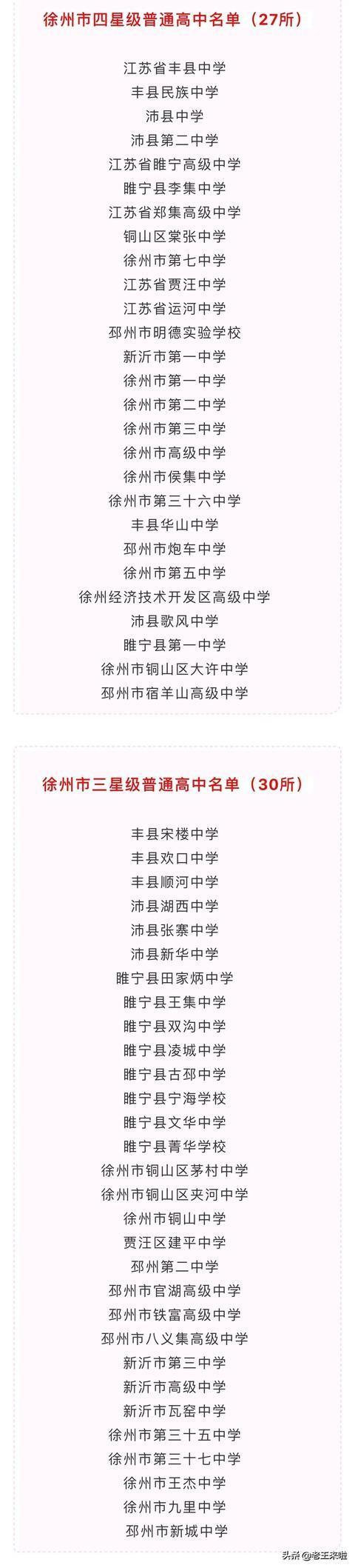 6月3日,徐州市教育局网站发布了全市四星级、三星级普通高中名单。其中四星级普通高中27所、三星级普通高中30所。