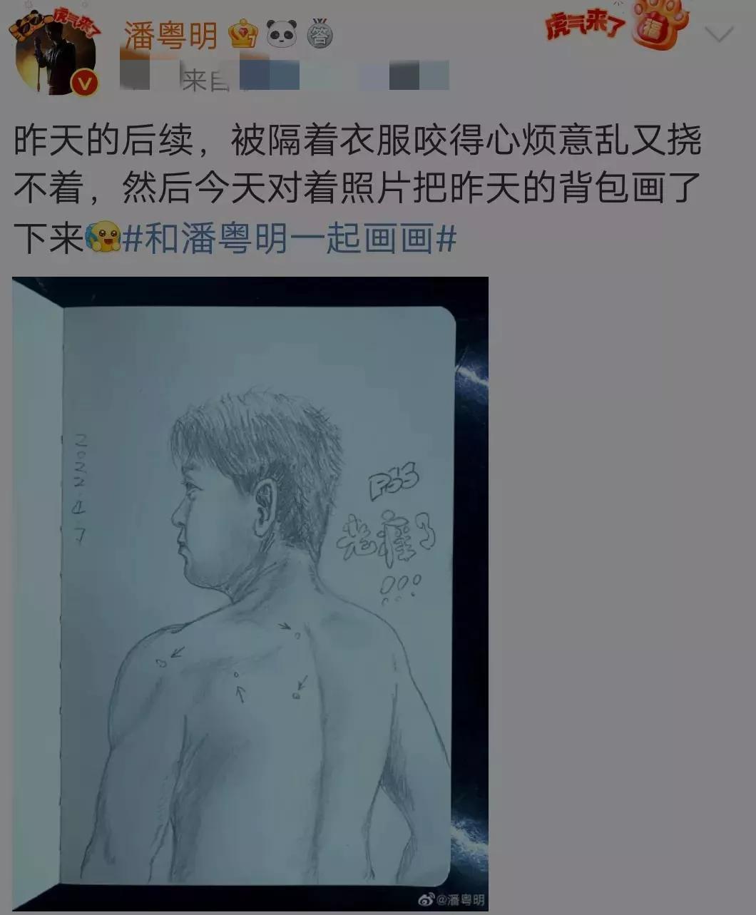 饰演过许仙的潘粤明,在社交平台上发文,抱怨自己穿着牛仔裤屁股还是被蚊子咬了,而且他这个“灵魂画手”,还专门晒图给网友看咬的大包。