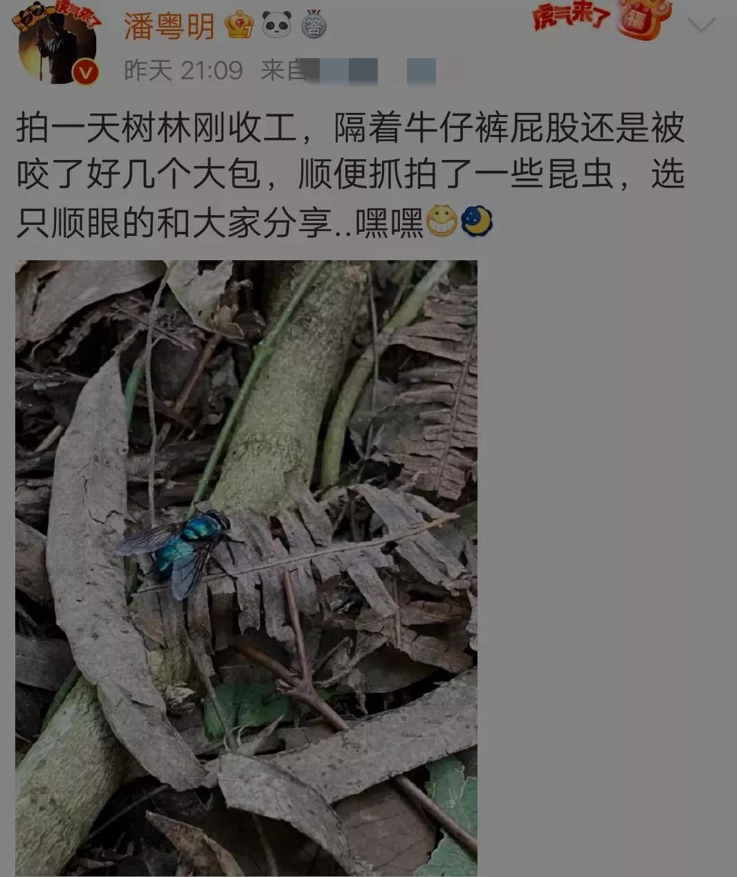 潘粤明最近不知道在哪里拍照,蚊虫很多,不仅仅是被叮咬,还经常走着走着就被吓一跳。