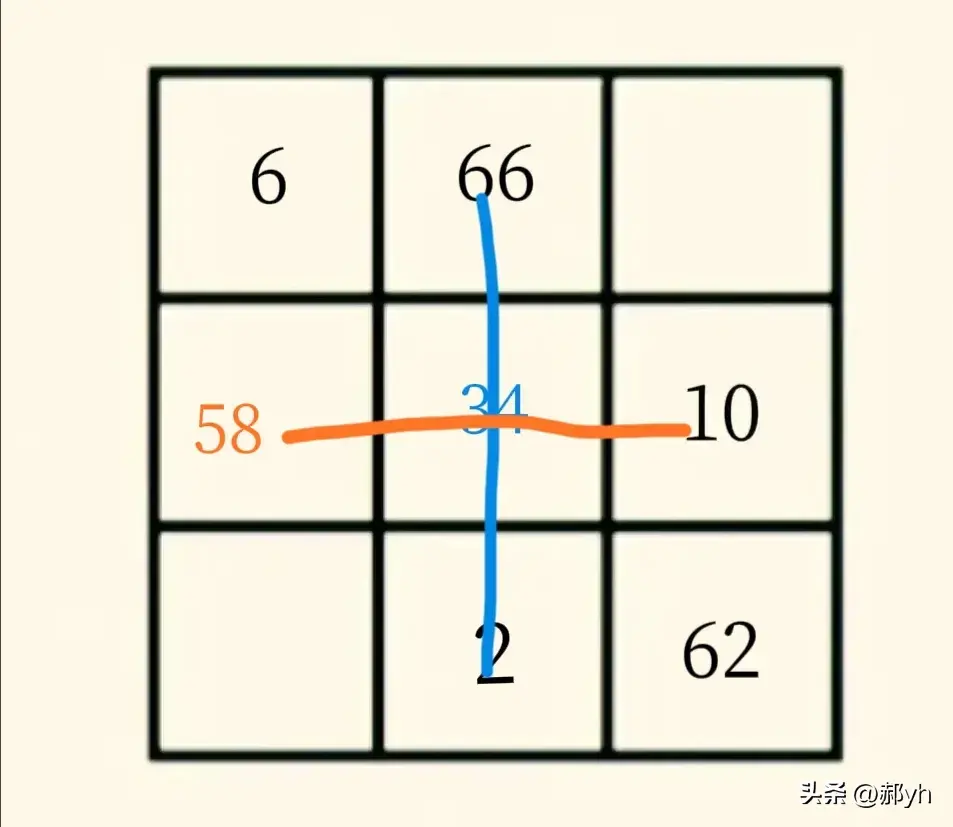 五、过中宫的线上三数等差,成等差数列,换言之,中间数为两端数的平均数。