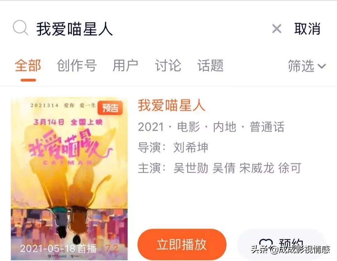 由吴倩、韩星吴世勋、宋威龙主演的电影《我爱喵星人》于今日16:00上线某视频网站首播。
