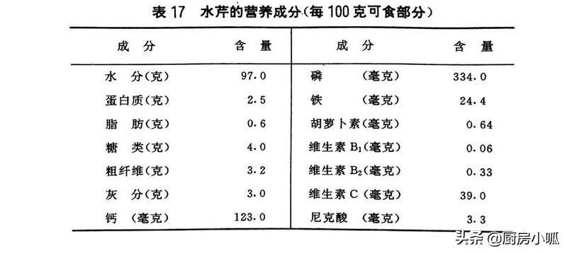 水芹的营养成分丰富,有一定的滋补作用。其药用价值也很高。人们常在春夏季节采摘其嫩茎用水烫后,既可炒食又可凉拌食用,其风味清香。