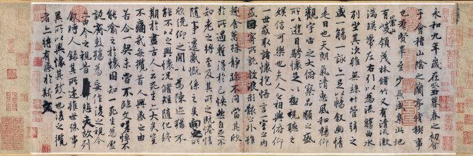 东晋穆帝永和九年(公元353年)三月三日,王羲之与谢安、孙绰等四十一位军政高官,在山阴(今浙江绍兴)兰亭“修禊”,会上各人做诗,王羲之为他们的诗写的序文手稿。《兰亭序》中记叙兰亭周围山水之美和聚会的欢乐之情,抒发作者对于生死无常的感慨。