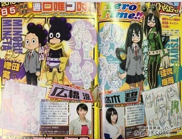 确定将于2016年4月播出的日五档动画「我的英雄学院」于昨日杂志图透追加了动画的两位声优,并公开了对应的人物设定图。曾为「魔法少女小圆」中鹿目圆配音的悠木碧将负责蛙吹梅雨一角,而「CLANNAD」中藤林杏的声优广桥凉则将负责峰田实的配音。