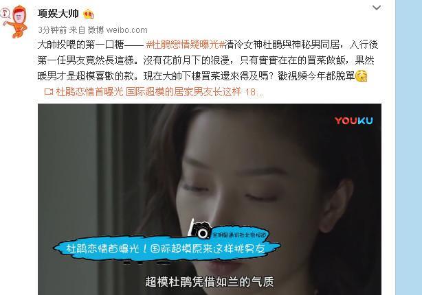 1月22日网友爆料称:杜鹃恋情疑曝光。清冷女神杜鹃与神秘男同居,入行后第一任男友竟然长这样。沒有花前月下的浪漫,只有实实在在的买菜做饭,果然暖男才是超模喜欢的款。