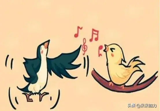 图上显而易见上面是两只小鸟,黑色翅膀的小鸟在扇动翅膀,好像是在跳舞一样,另外一只黄色的小鸟,站在树枝上,张着嘴不知道在说些什么,中间有一些音乐的符号,看了这幅图之后!