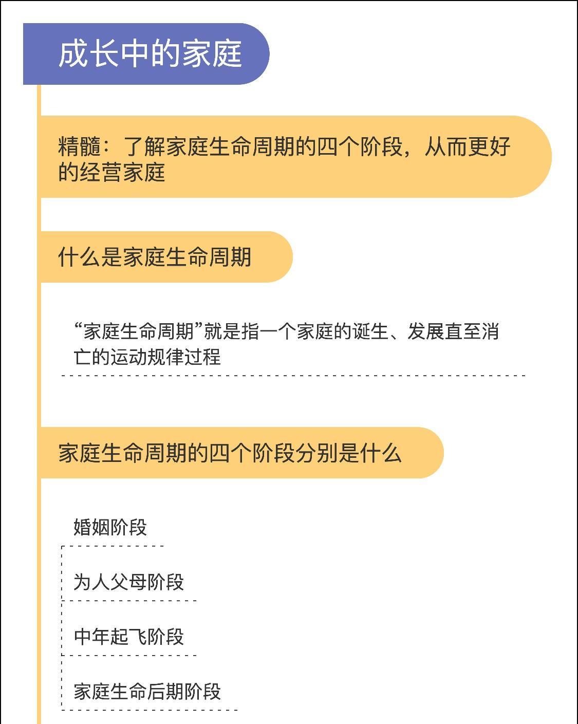 这里,我们说的家庭生命周期主要包括婚姻阶段、为人父母阶段、中年起飞阶段以及家庭生命后期阶段这四个阶段。
