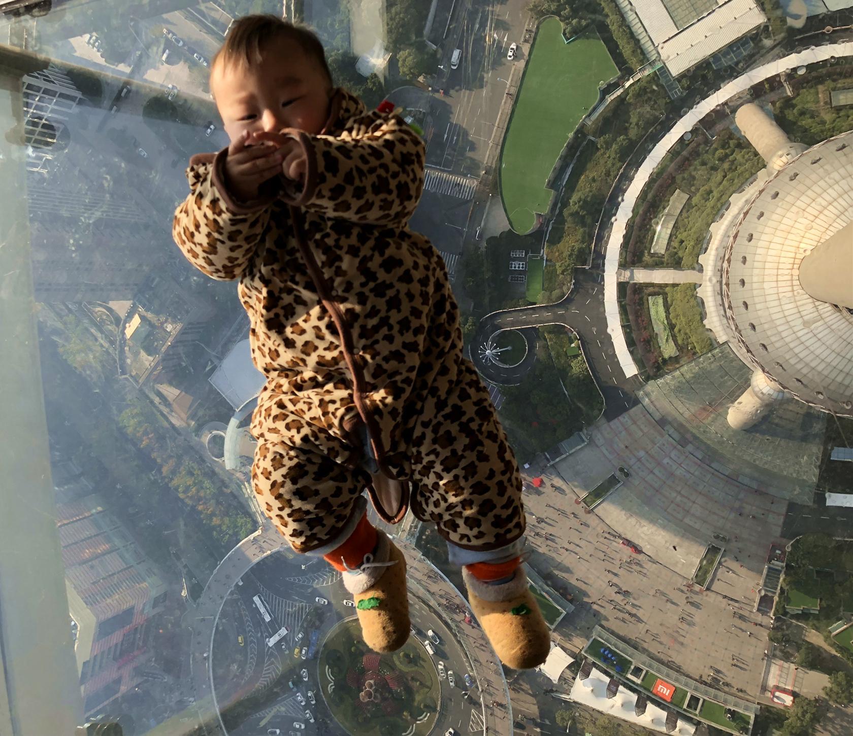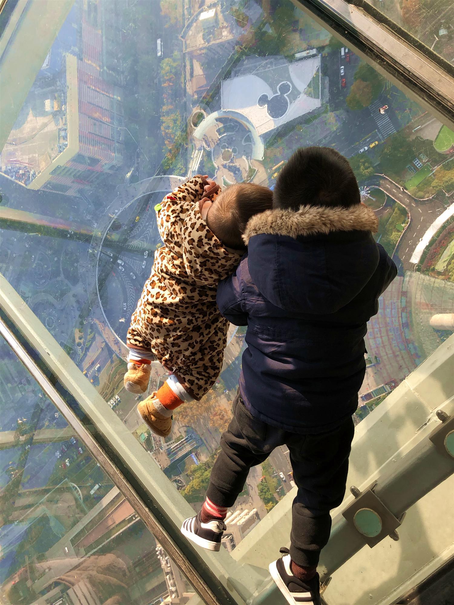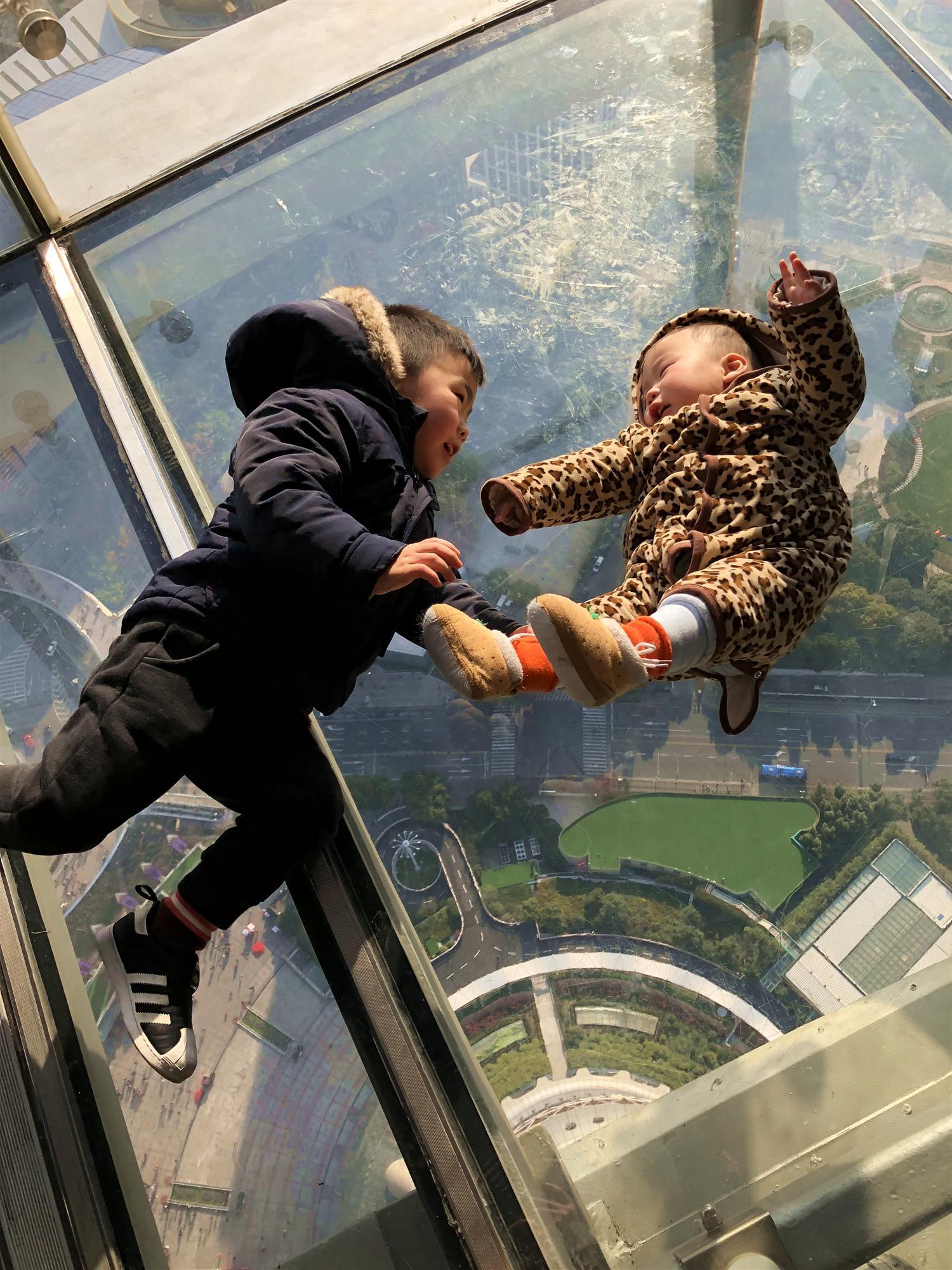 逛好这层,我们走过一层楼梯,就来到了全透明悬空观光廊。我站上去觉得心是慌的腿都抖的,可是两小只在上面摸爬滚打玩的不亦乐乎不肯走,玩了很久,几次想把誉宝从玻璃上抱走他都不肯,抱起来就哭,放下去就好了,只能让他继续滚。。。其他游客看到这两小只在玻璃上打滚也觉得太搞笑了。只能说,初生牛犊不怕虎啊,完全不心慌的。