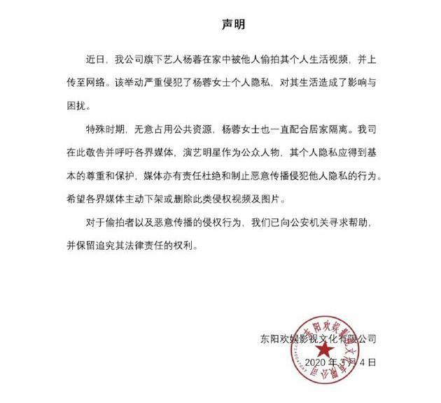 此举引发了广大网友的满。作为媒体来讲,不论是公司还是个人,均无权在未取得对方同意的情况下拍摄且上传他人生活隐私,杨蓉所在的东阳欢娱影视文化有限公司对此很快做出了回应:
